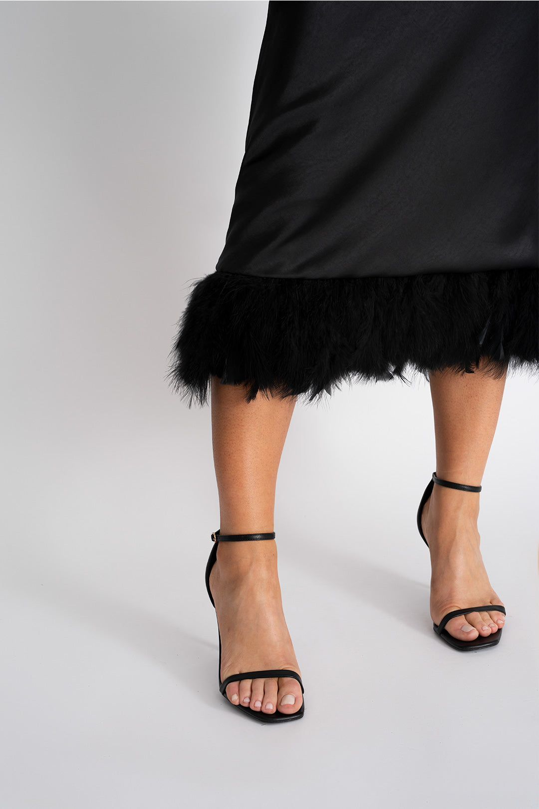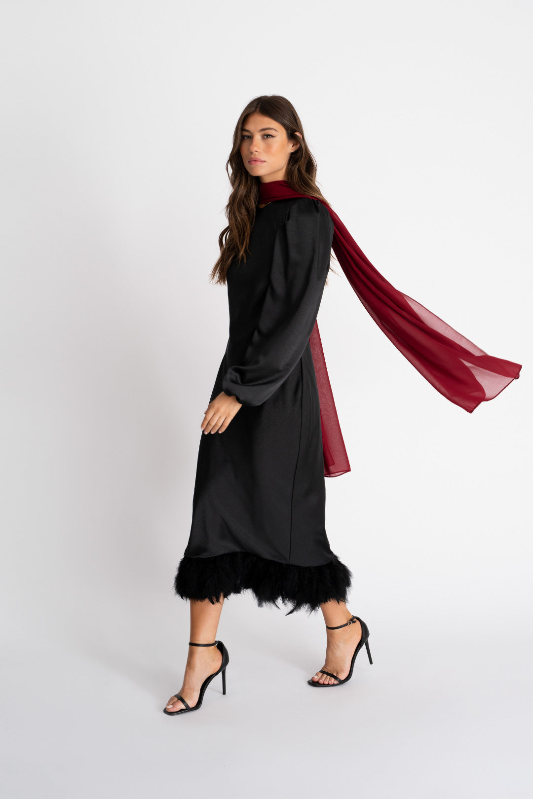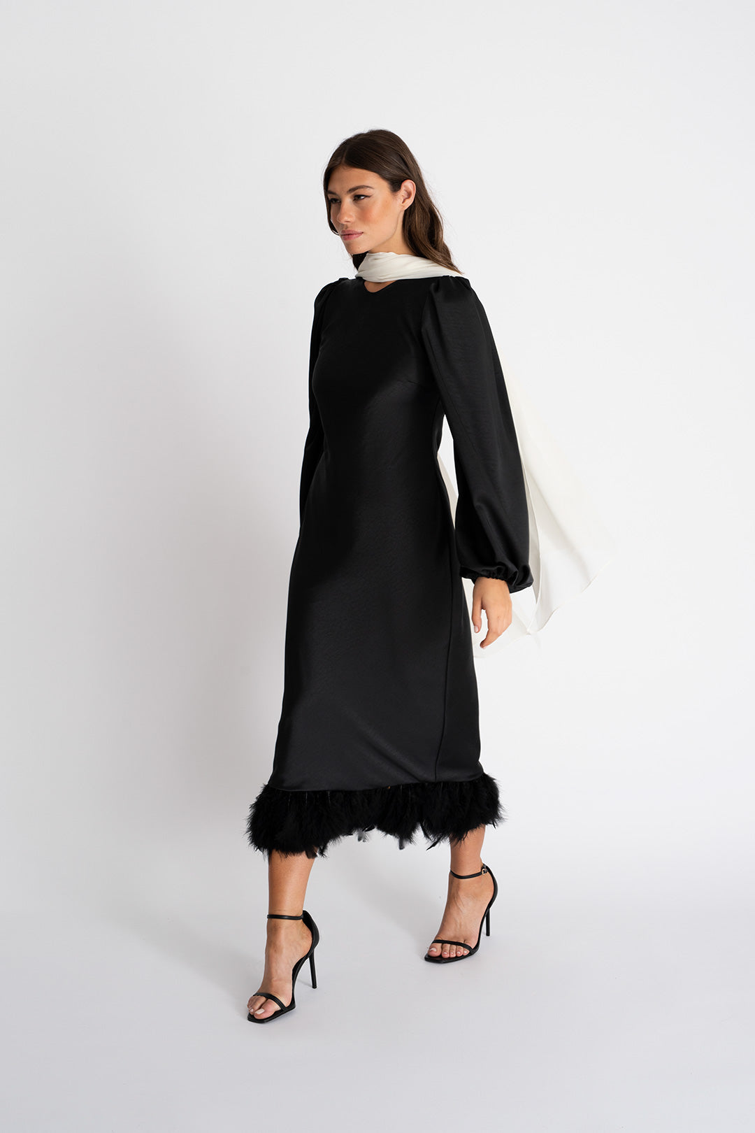 The dress's bodice is satiny black, with puffed sleeves, a black feather trim at the hem, and a midi length. At Satela, we strive for versatility in each of our pieces, which is why Martini is our version of the Little Black Dress that absolutely needs to be part of your wardrobe.