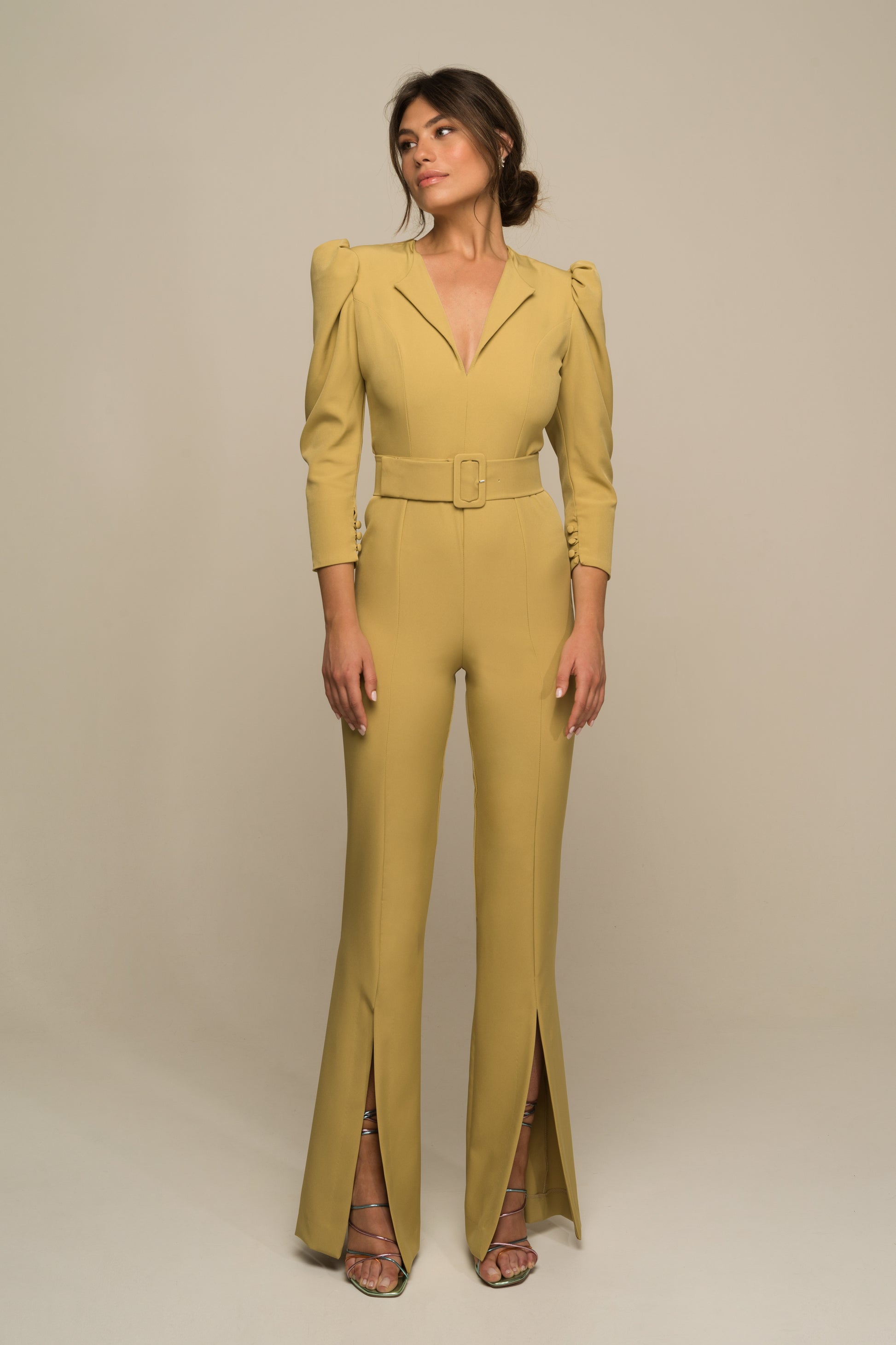 El mono Bianca es un diseño hecho 100% en España que tiene un cuello solapa tipo smoking, mangas abullonados de corte afrancesado. De estilo ajustado hasta la rodilla y cuyo bajo posee una abertura central que se abre al caminar. La cremallera invisible se encuentra en la parte trasera de la prenda. El look queda rematado con un cinturón forrado en la misma tela como complemento que puedes añadir o no según tu gusto.