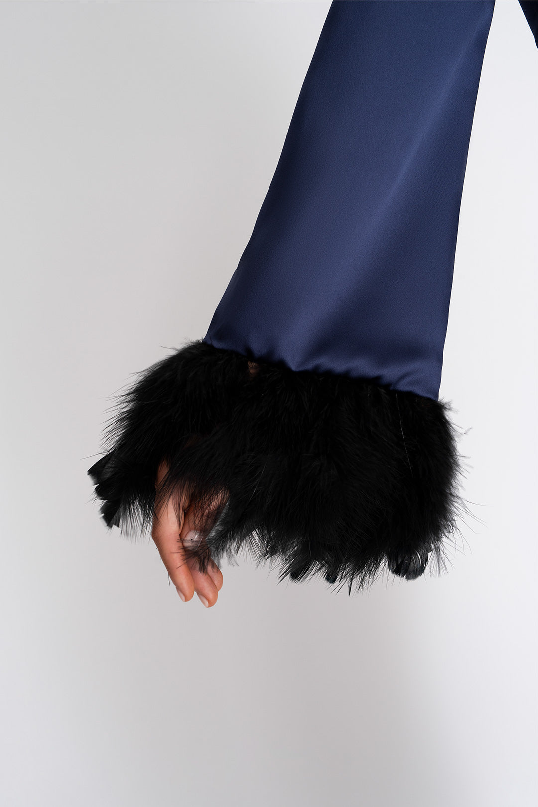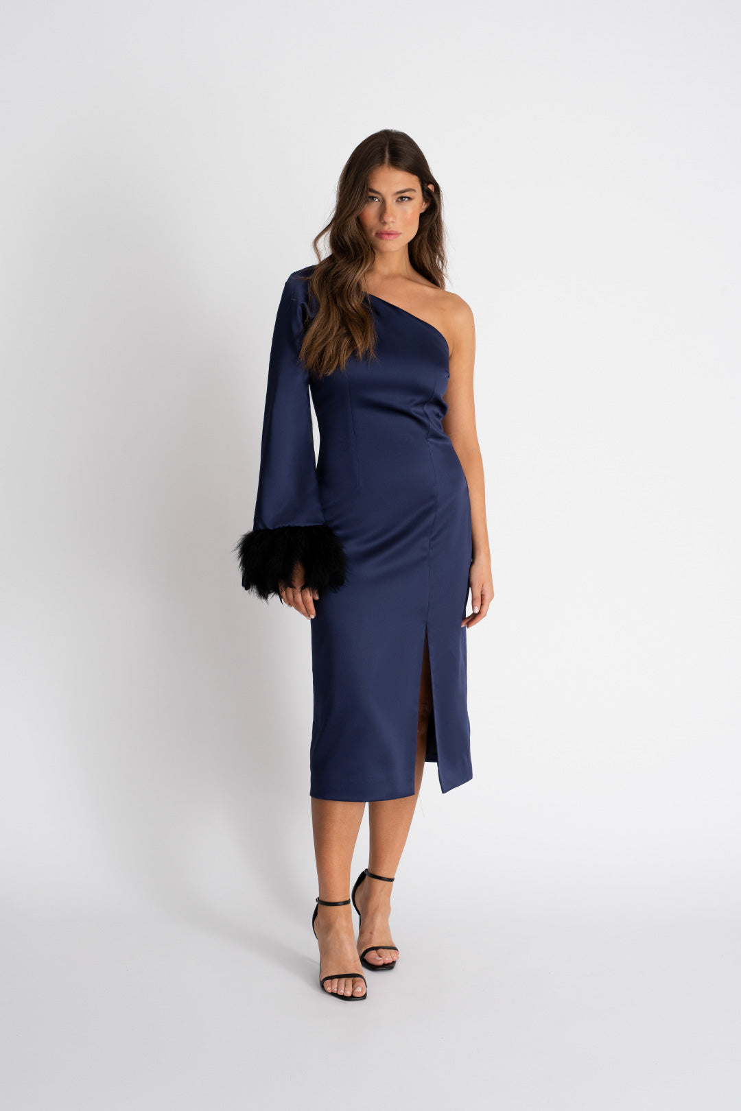 El diseño se presenta como un vestido asimétrico con manga acampanada rematada con plumas, ajustado en la cintura, largo midi y una delicada apertura