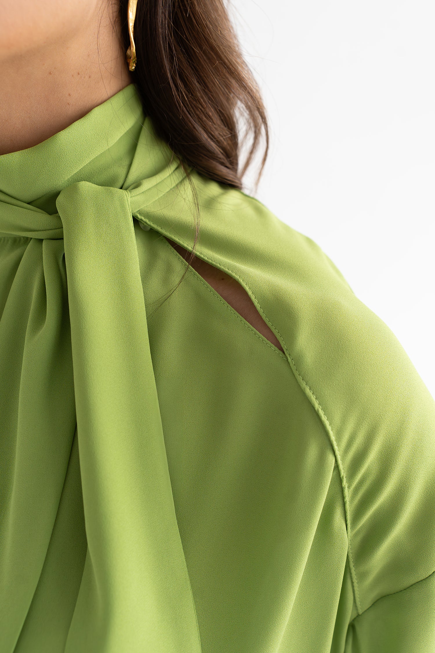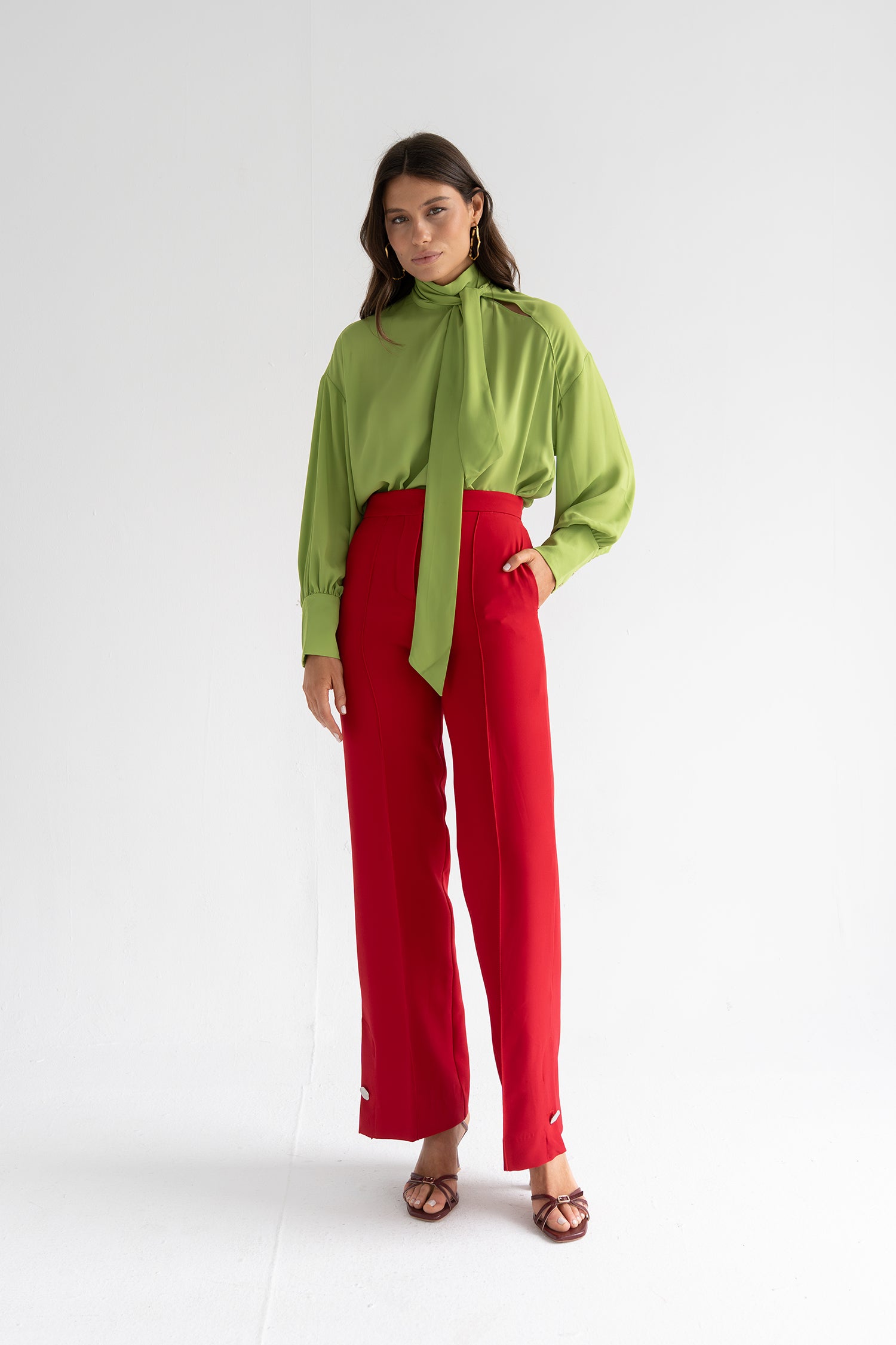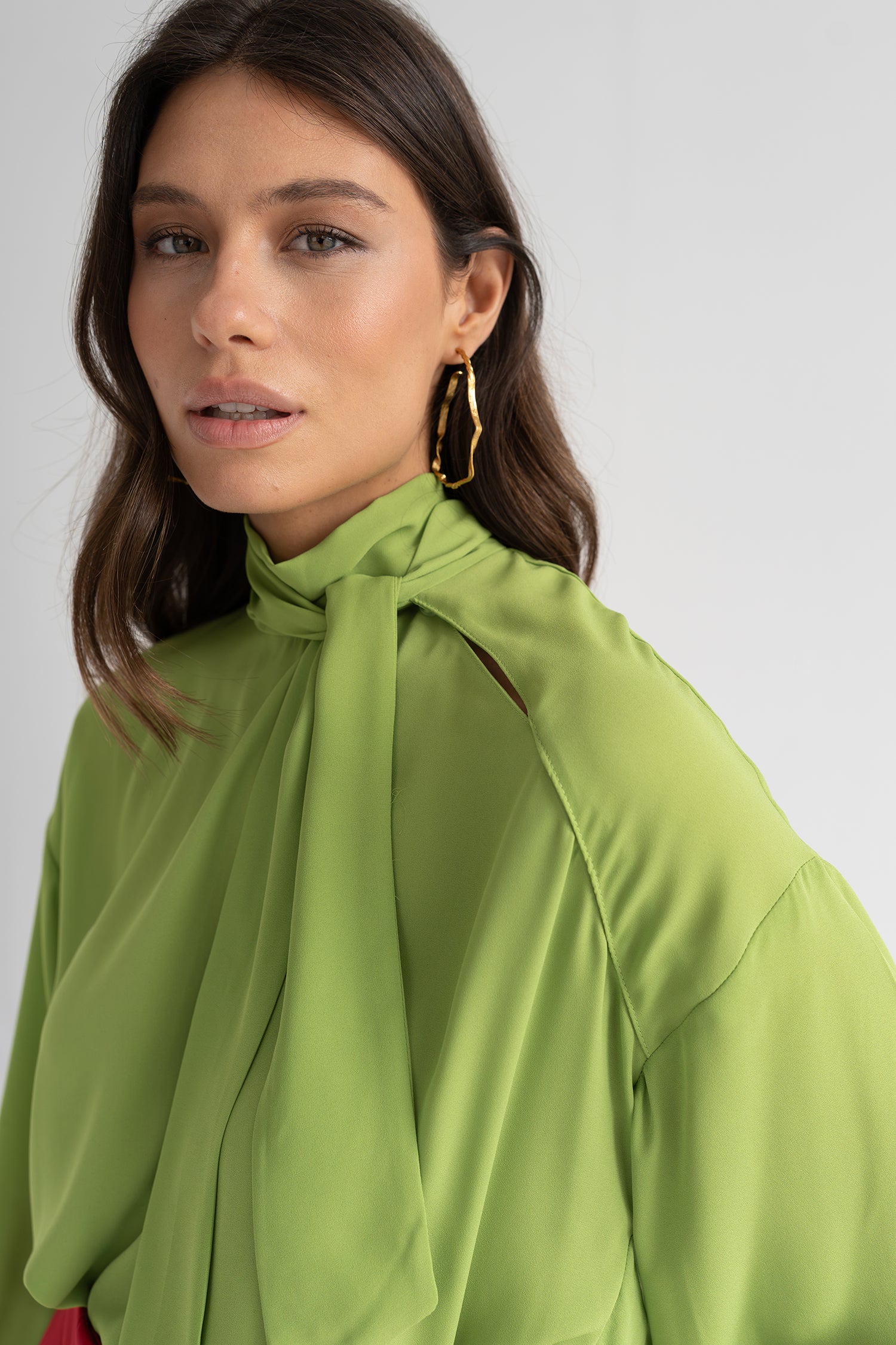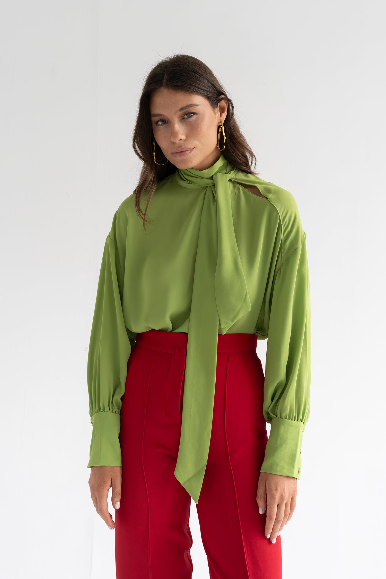 Blusa de cuello subido con lazada larga que cae con movimiento. Su silueta amplia y manga con volumen crean un juego de proporciones sofisticado, equilibrando estructura y fluidez en una prenda con personalidad.
