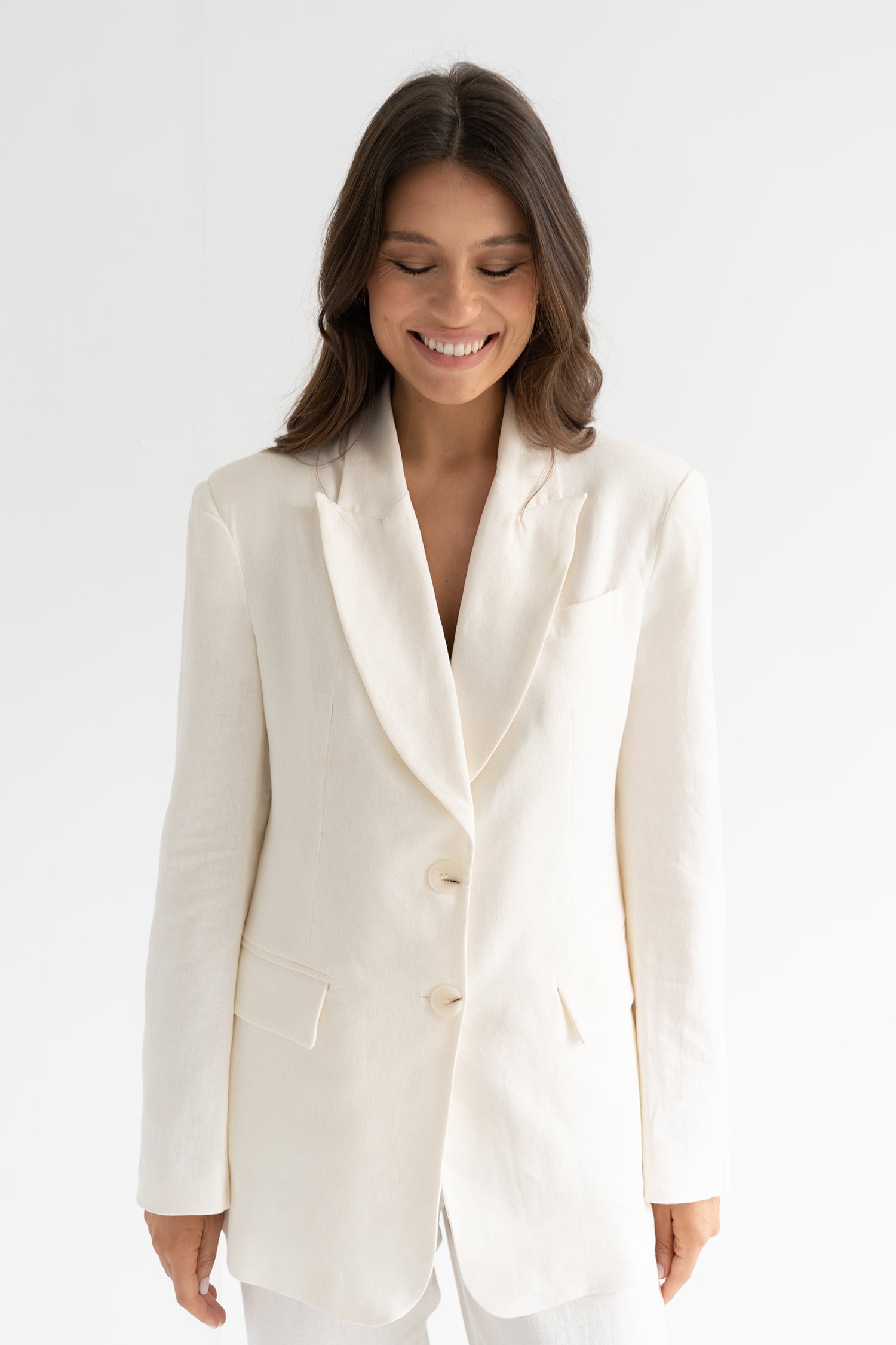 Chaqueta confeccionada en lino de líneas limpias y silueta relajada. De corte ligeramente oversize y hombro estructurado, equilibra fuerza y naturalidad en una prenda pensada para acompañar con elegancia sin esfuerzo. Cierre frontal con botones y bolsillos de solapa que aportan carácter y funcionalidad.