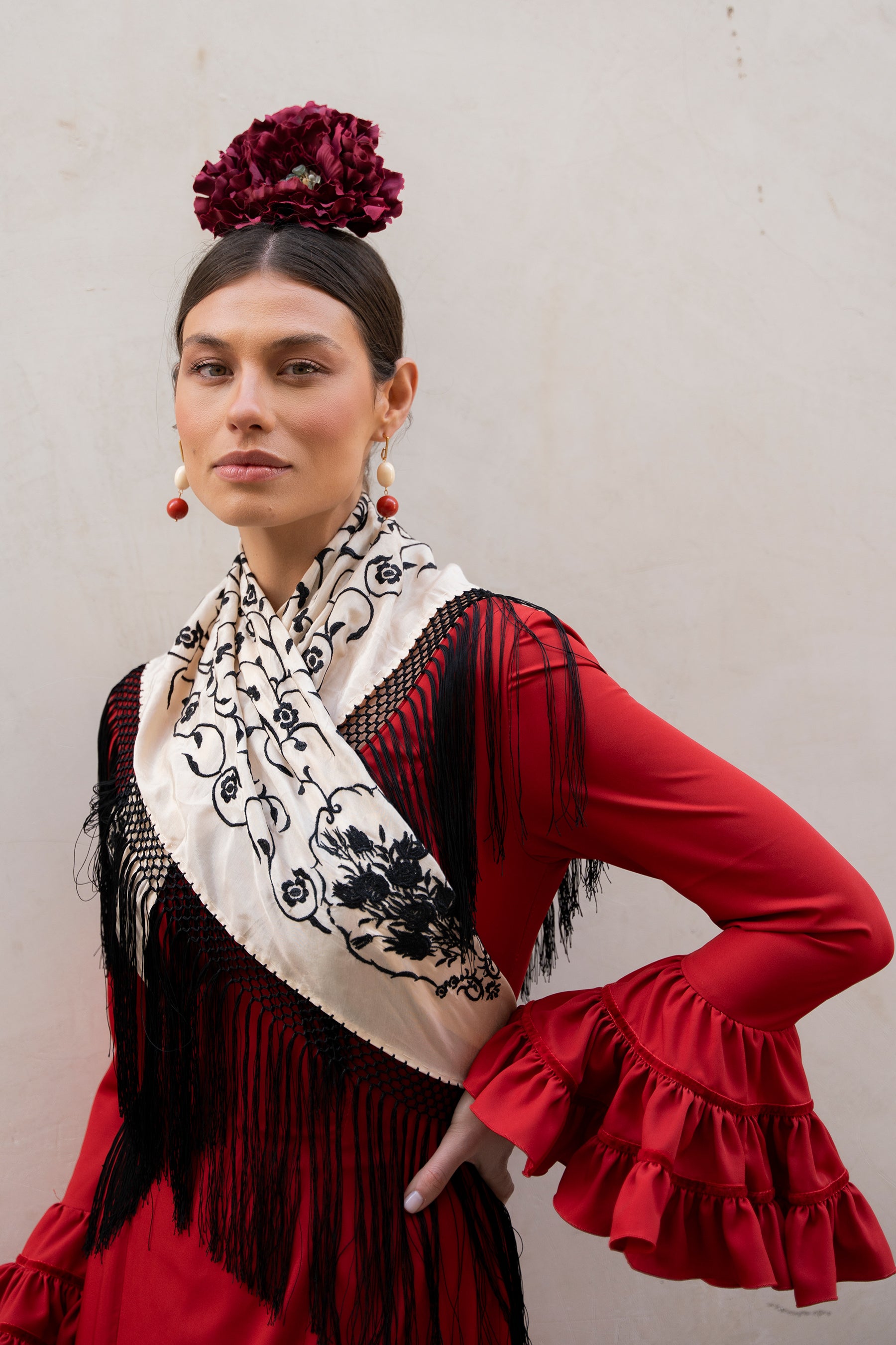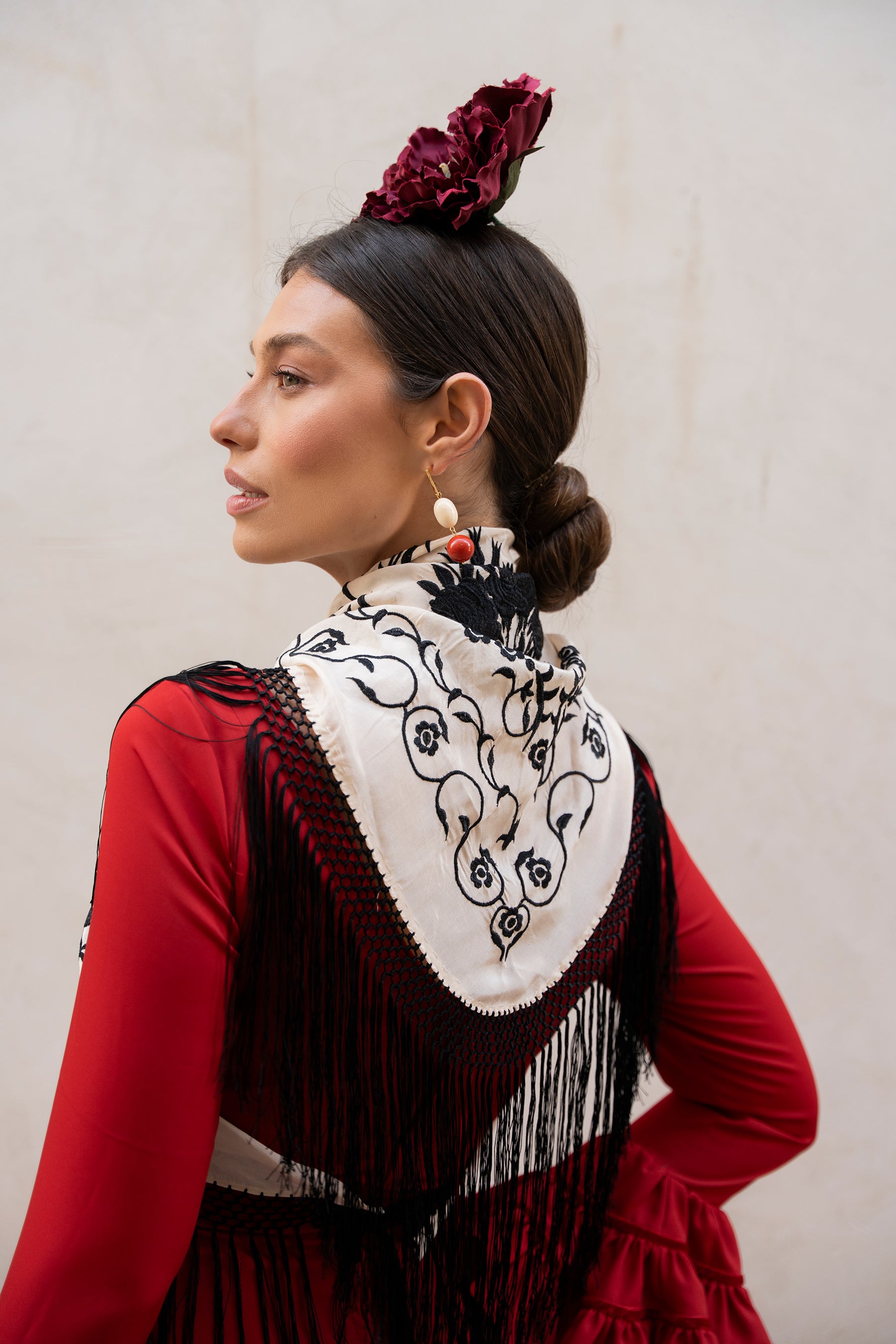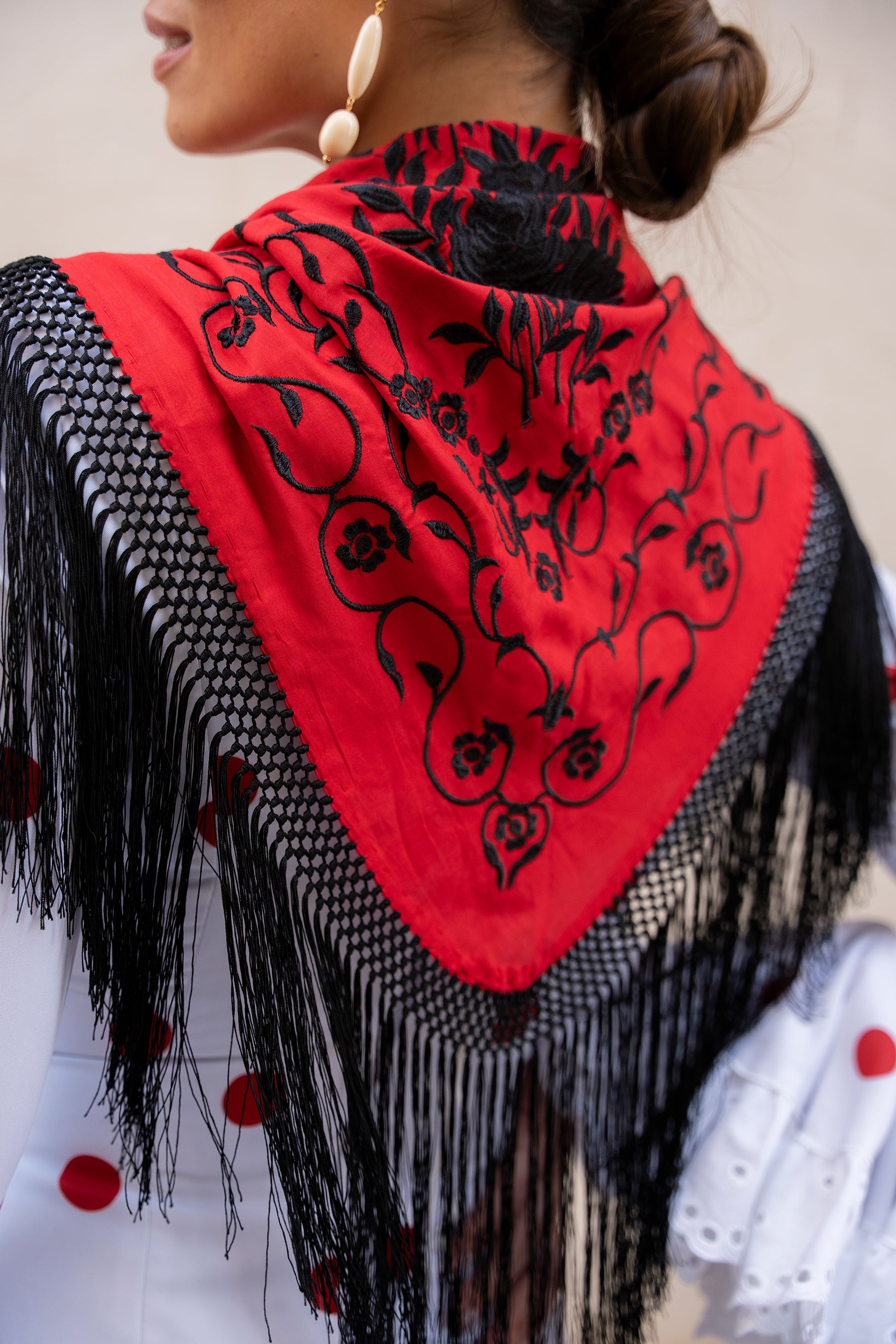 Mantoncillo de flamenca con flores bordadas en negro, confeccionado artesanalmente en Andalucía. Alegre y lleno de vida, ideal para complementar tu traje de flamenca con un toque de color y elevar tus looks de invitada.