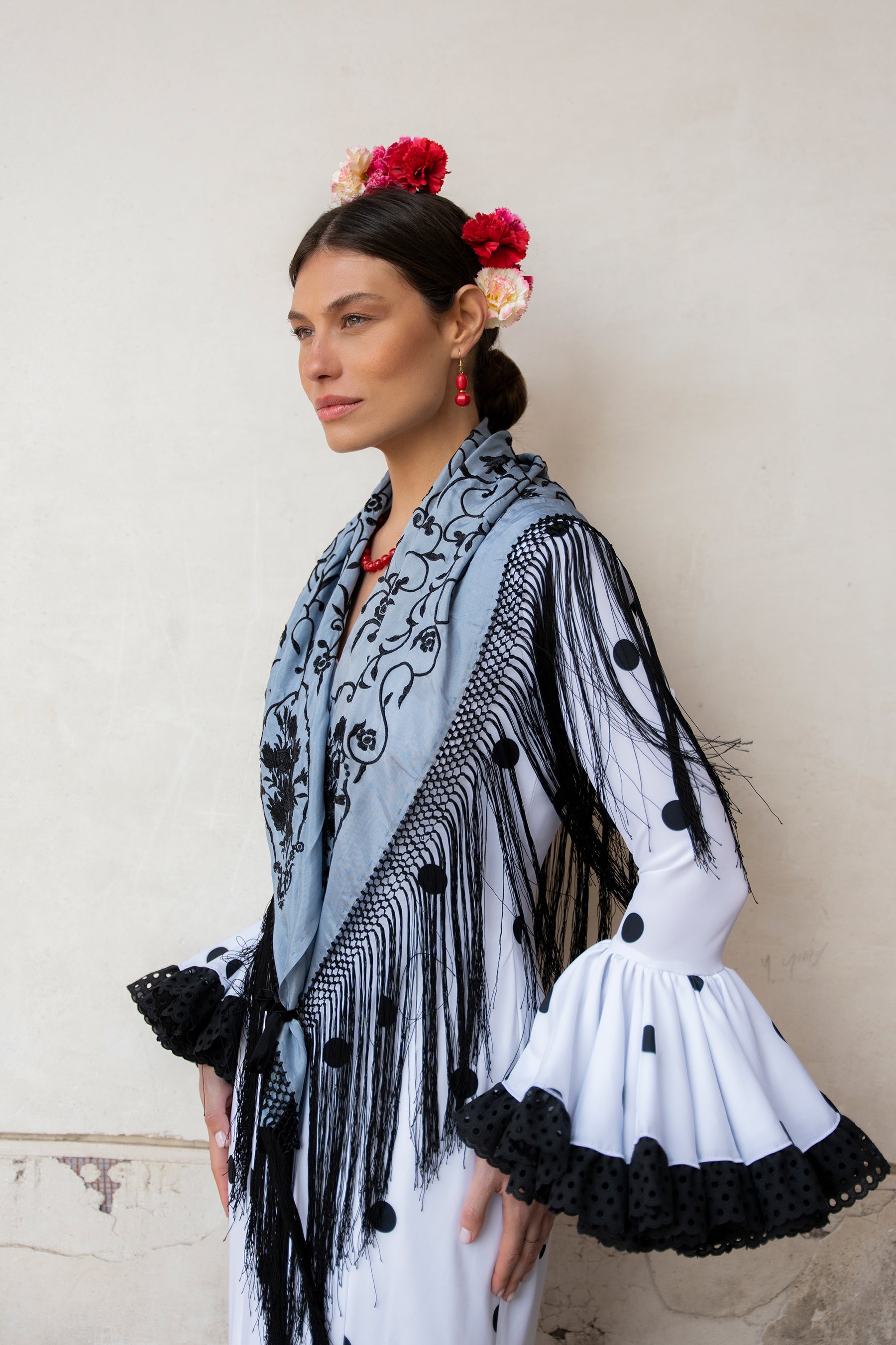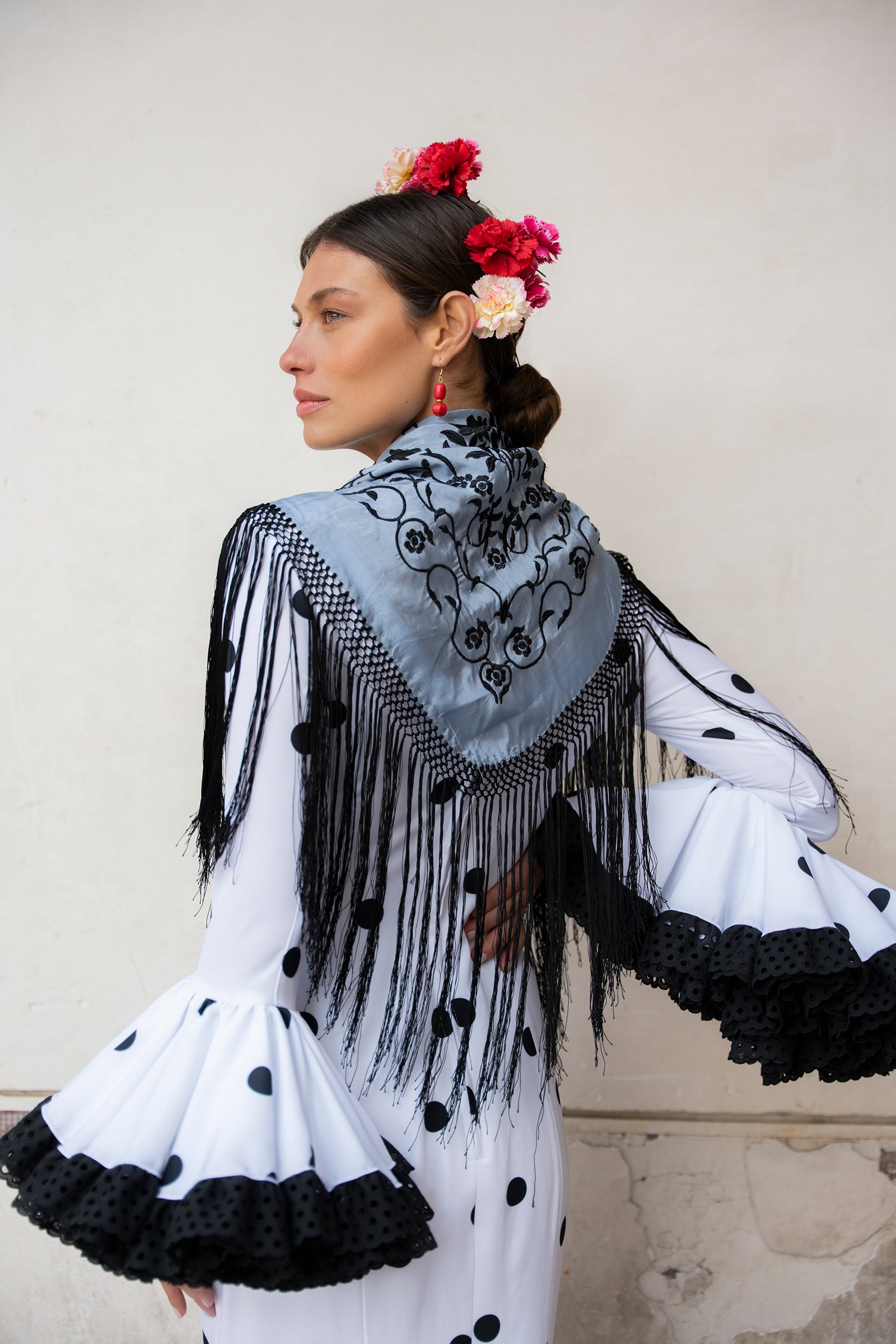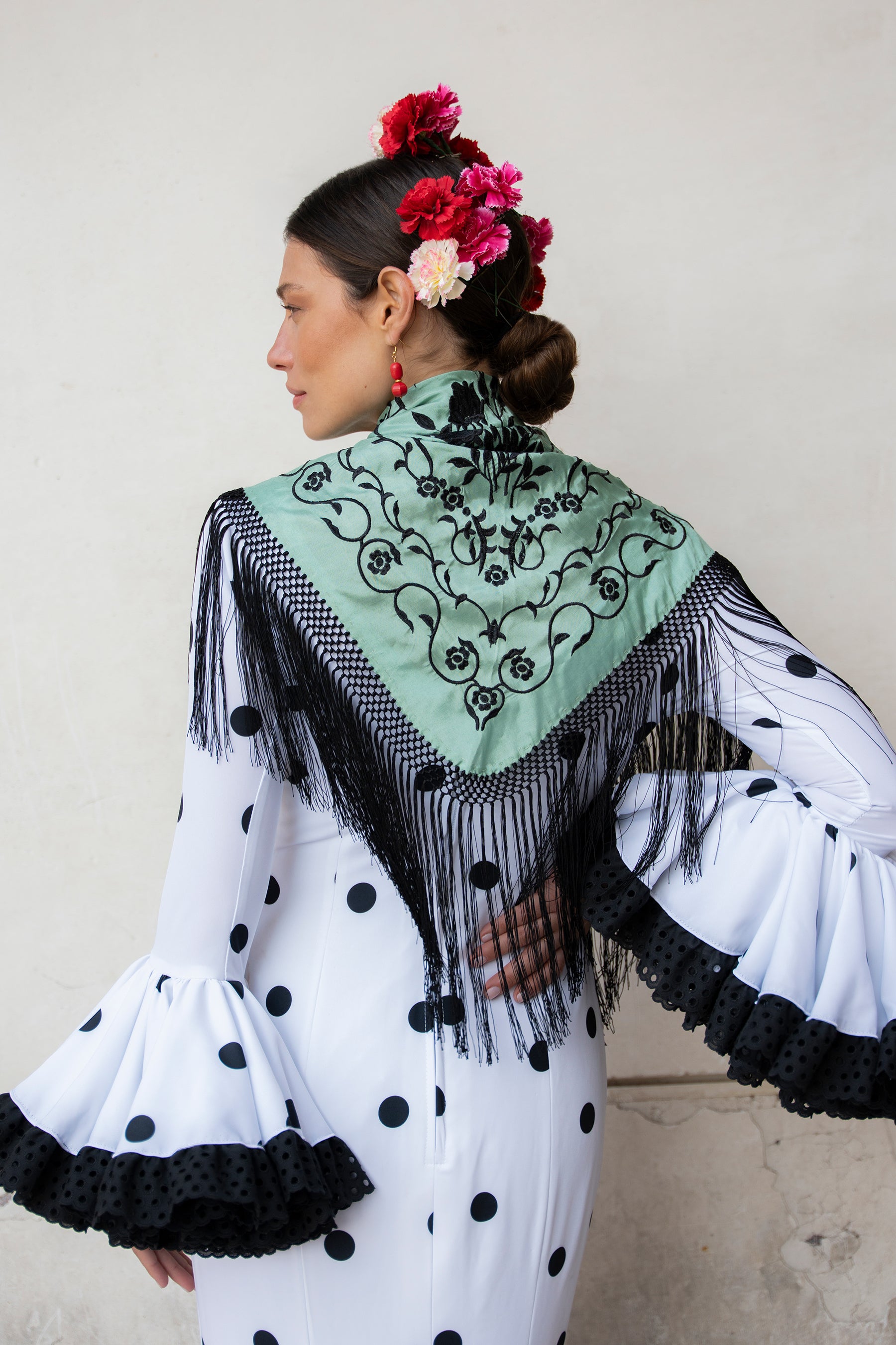 Mantoncillo de flamenca con flores bordadas en negro, confeccionado artesanalmente en Andalucía. Alegre y lleno de vida, ideal para complementar tu traje de flamenca con un toque de color y elevar tus looks de invitada.