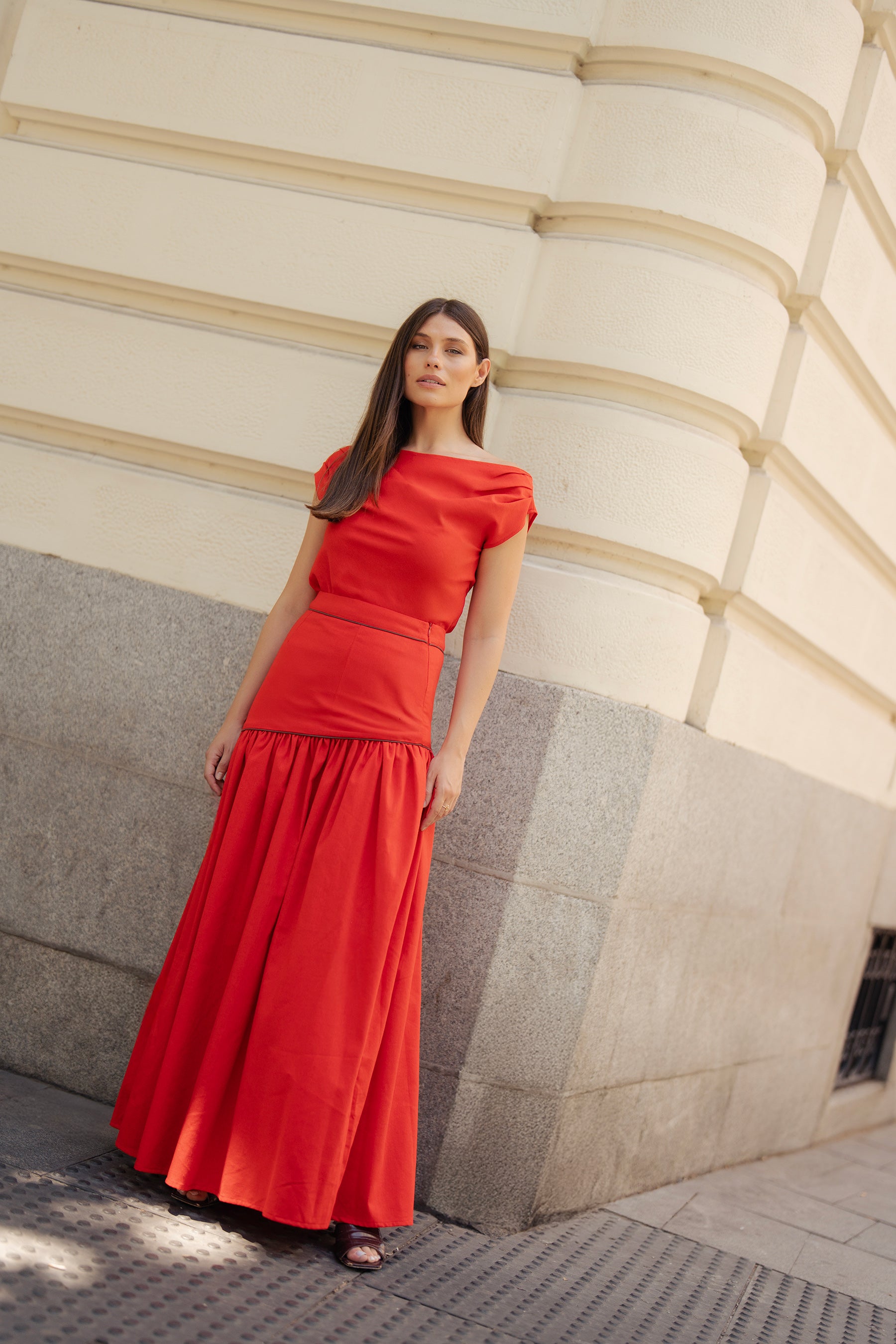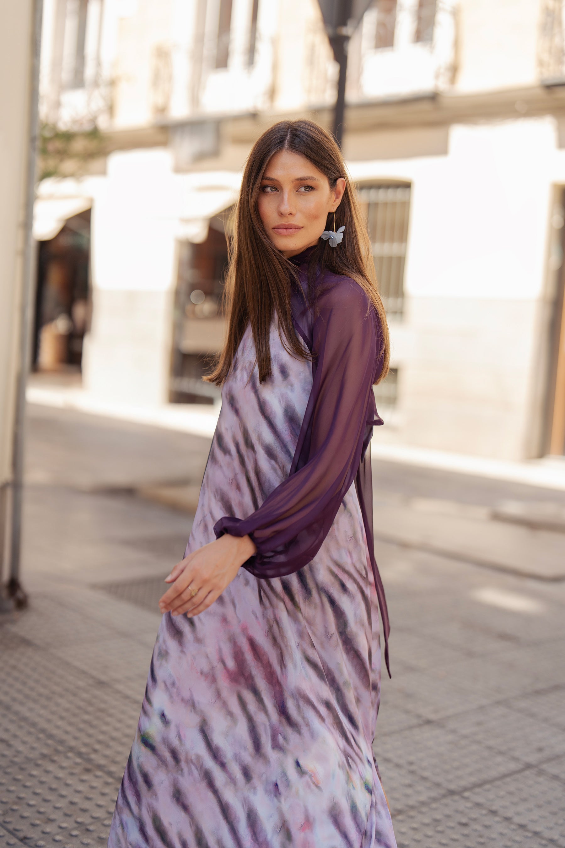Vestido largo de cuello halter. Una prenda de estilo oversize que resalta la figura de la mujer. La pieza tiene una apertura lateral para proporcionar un mayor movimiento y vaporosidad a la hora de caminar.