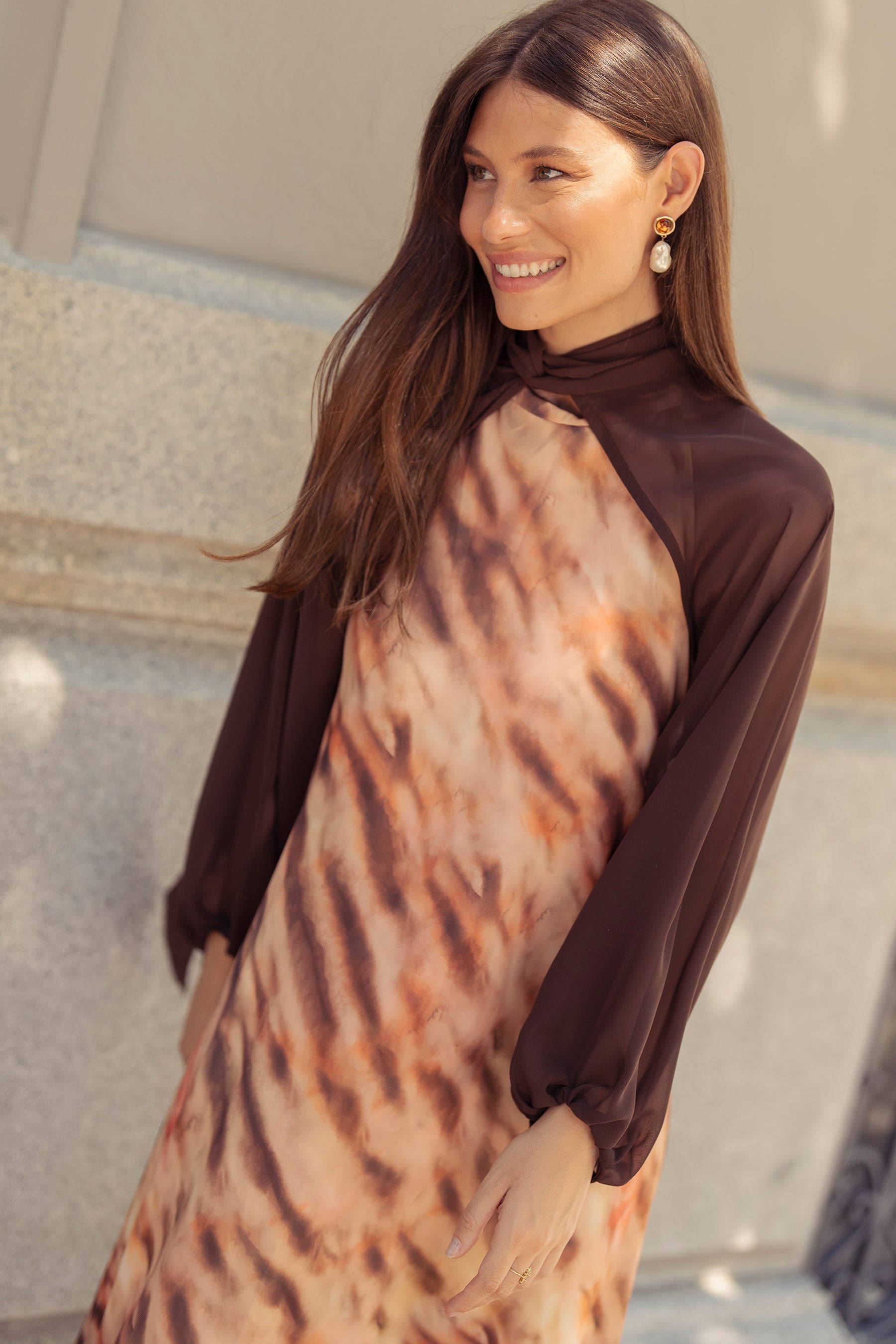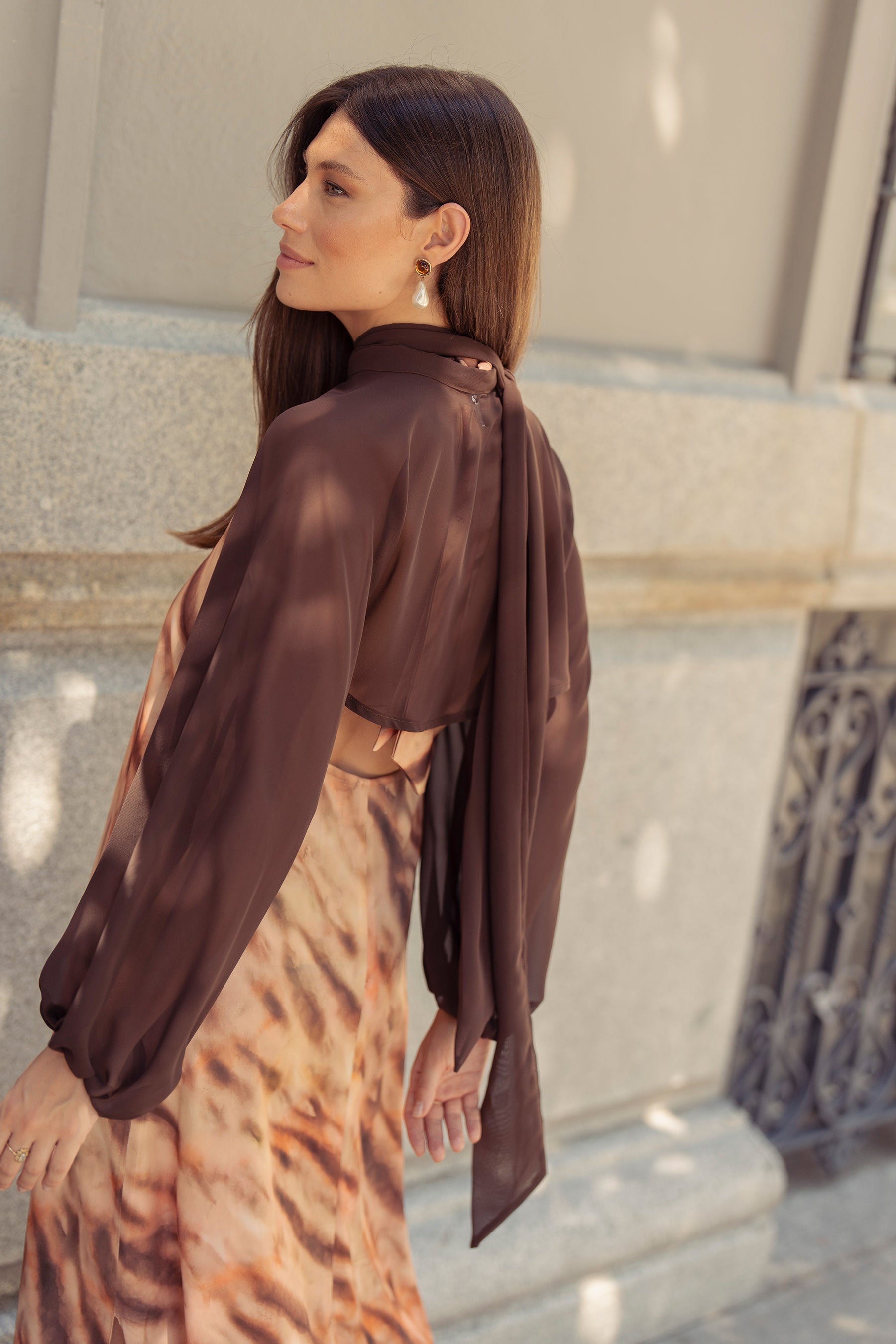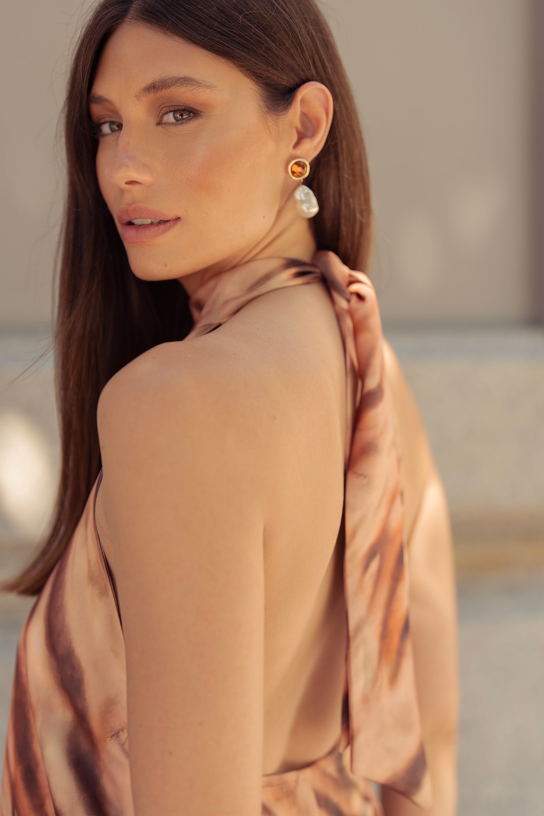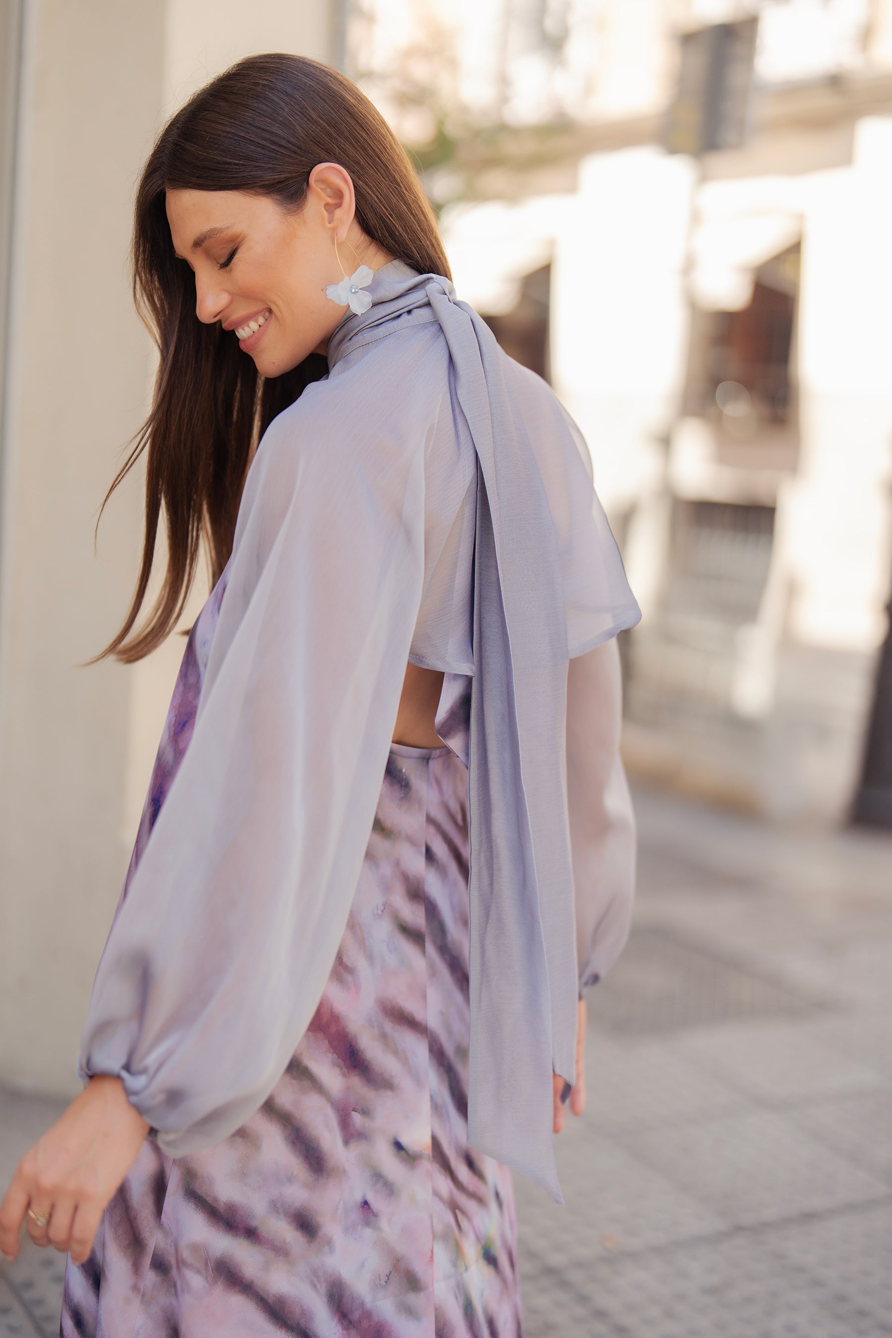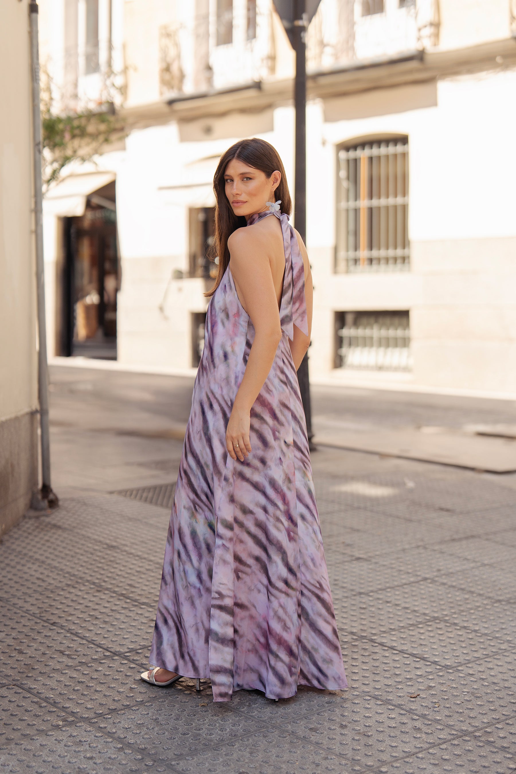 Vestido largo de cuello halter. Una prenda de estilo oversize que resalta la figura de la mujer. La pieza tiene una apertura lateral para proporcionar un mayor movimiento y vaporosidad a la hora de caminar.
