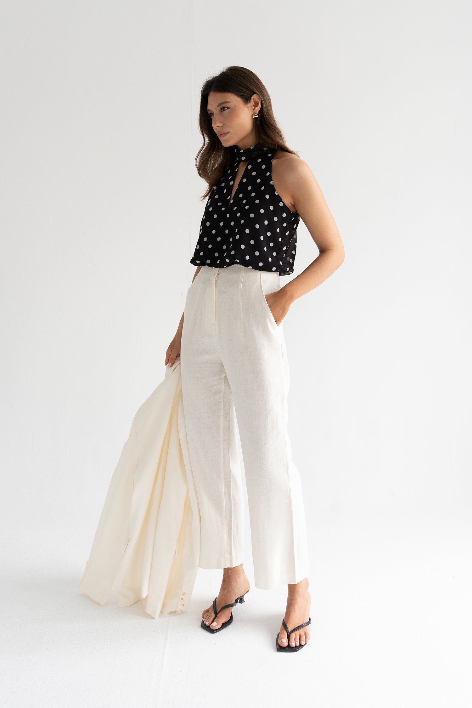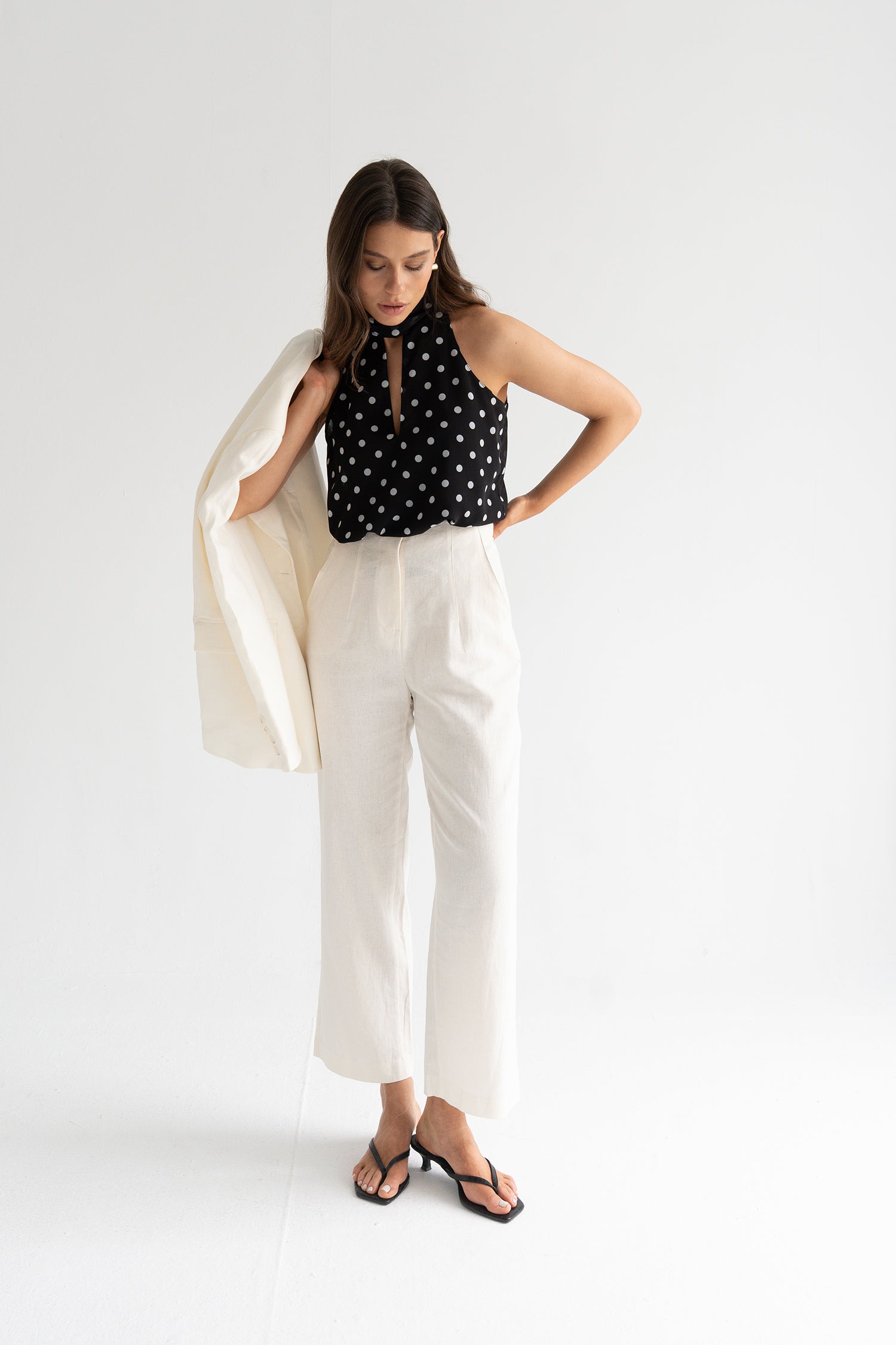 Pantalón de lino de tiro medio y pernera recta, diseñado para estilizar la silueta con naturalidad. Su caída fluida y estructura ligera aportan movimiento, manteniendo una estética depurada y sofisticada. Cierre frontal discreto y acabado limpio que refuerza su carácter atemporal.