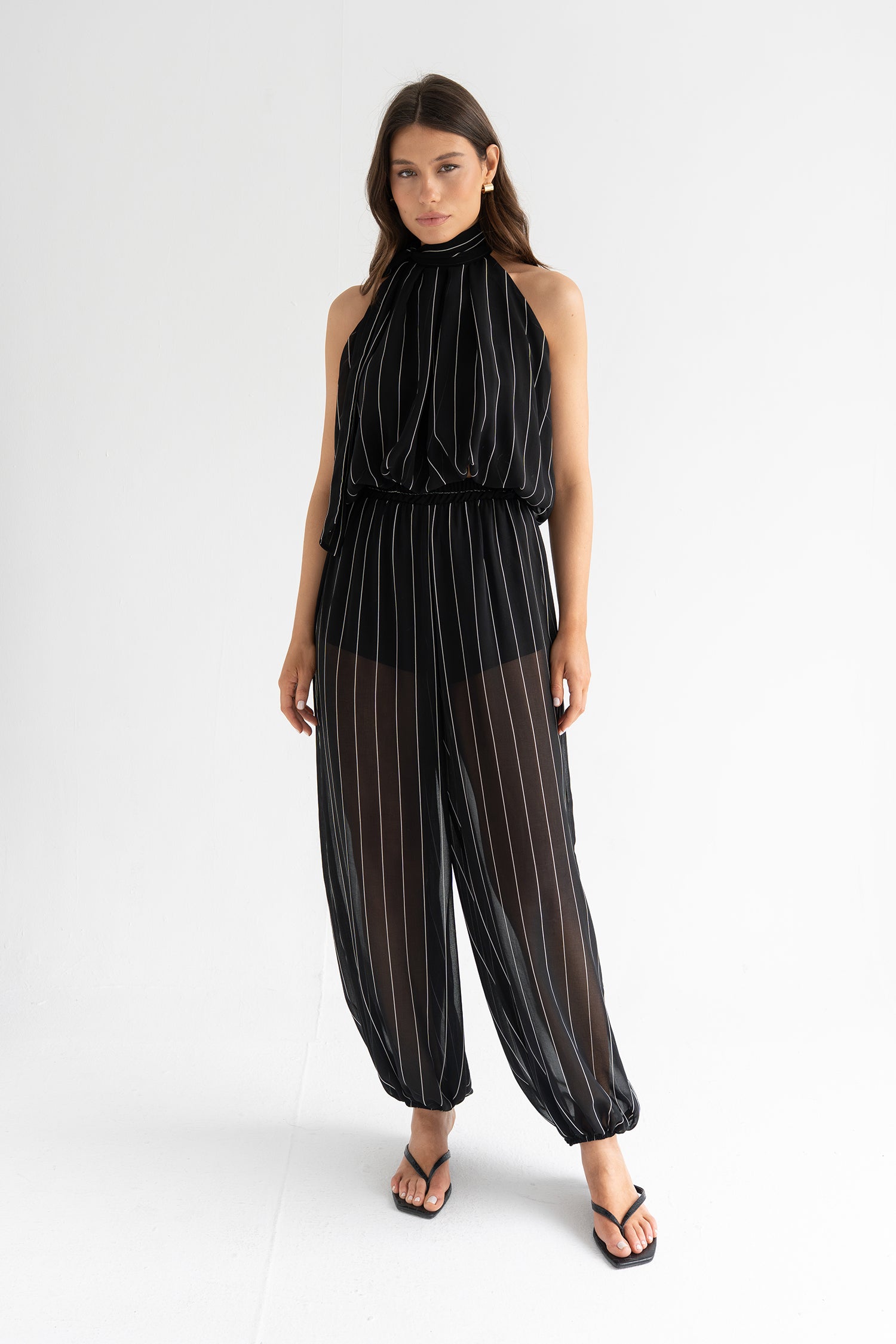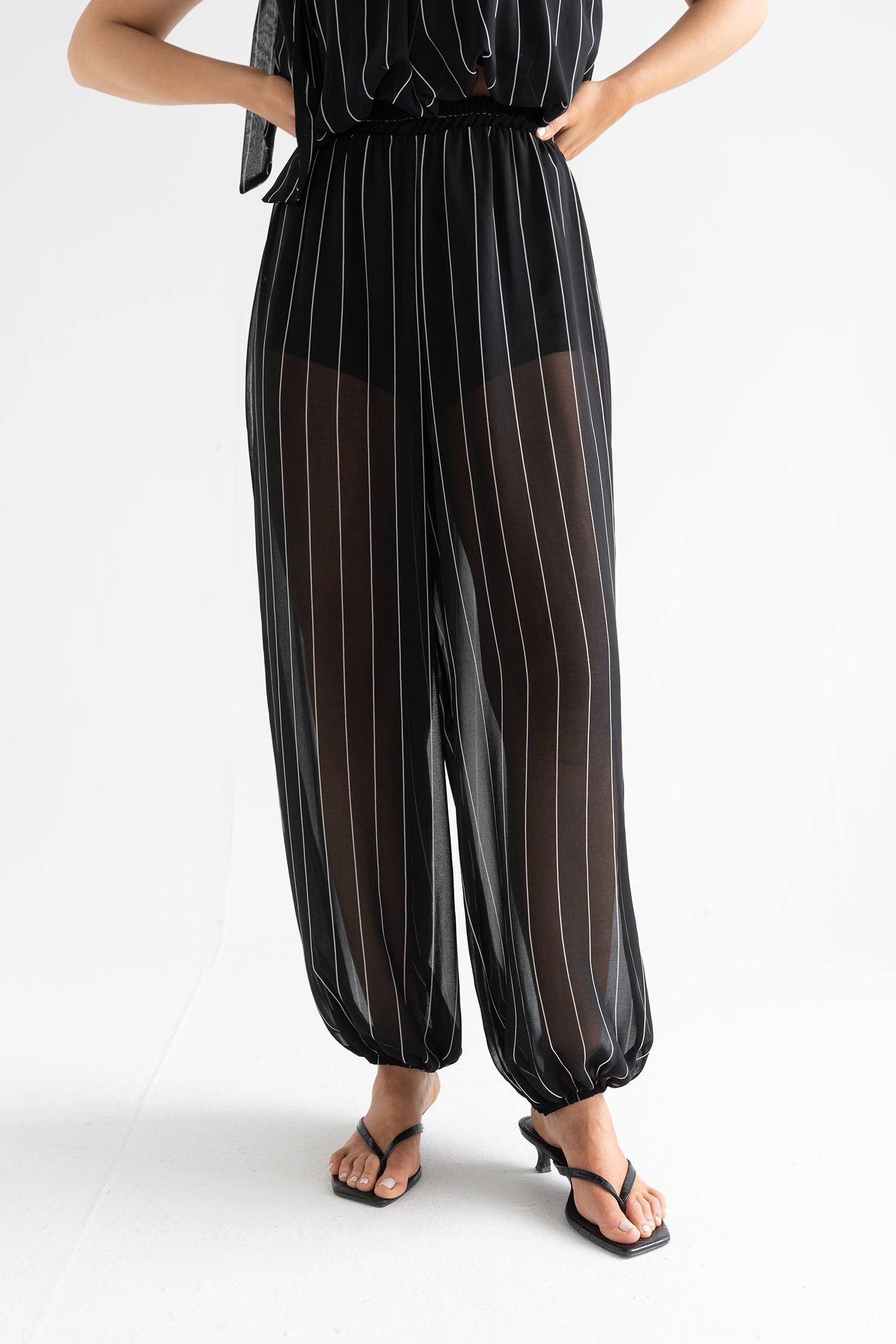 Pantalón confeccionado en tejido de rayas. De tiro medio y cintura elástica, se adapta con comodidad a la silueta sin perder elegancia. El bajo acabado abullonado con puño elástico aporta un toque distintivo y actual, creando volumen y movimiento en cada paso.